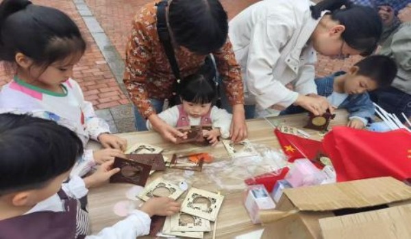 活動中,家長和孩子分工協(xié)作,有人勾勒國旗紋路,有 人調(diào)配“ 中國紅” ,有人繪制“我愛中國”“五角星”等國 慶元素,圖案躍然娃娃身上。孩子們舉著作品歡呼,家長用 鏡頭定格溫馨,現(xiàn)場歡聲笑語不斷,童趣與愛國情懷在色彩 中交融綻放。